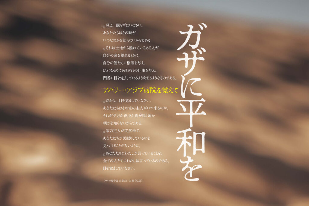 2023年10月17日にパレスティナのガザにあるアハリー・アラブ病院が爆撃されたというニュースが飛び込んできました。親しい人たちがアハリー・アラブ病院を支援する会を運営しており、そのひとりである友人(本サイトの企画者)から今月の聖書箇所のマルコ福音書13章33−37節が伝えられると同時に、ガザで起きている現実に胸が潰れるとの言葉が送られてきました。冒頭に引用したのは「小黙示」(マルコ福音書13章)と呼ばれる聖書の一節であり、世の終わりがやって来るときに目を覚ましているようにと警告するイエスの言葉です。これは世の終わりを予期しているという意味では、現代世界に生きるわたしたちには非現実的に映ってしまうかもしれませんが、友人が着目したのは37節「あなたたちにわたしが言っていることを、全ての人たちにわたしは言っているのである。目を覚ましていなさい」という言葉です。ガザの人たちは現実に安心して居眠りなどすることのできない状況に置かれていることをわたしたちは知らされています。それは小黙示が伝える終末の戦争を彷彿とさせます。イエスの言葉はパレスティナとイスラエルにだけに向けられているのではなく、わたしたち「全ての人たち」に「見よ、眠らずにいなさい/目を覚ましていなさい」と告げているのです。それは戦争のためにではなく、平和のためにです。ガザに平和をとの願いを込めて、アハリー・アラブ病院を覚えて支援の輪を広げたいとの思いでいます。(小林昭博/酪農学園大学教授・宗教主任、デザイン宗利淳一)