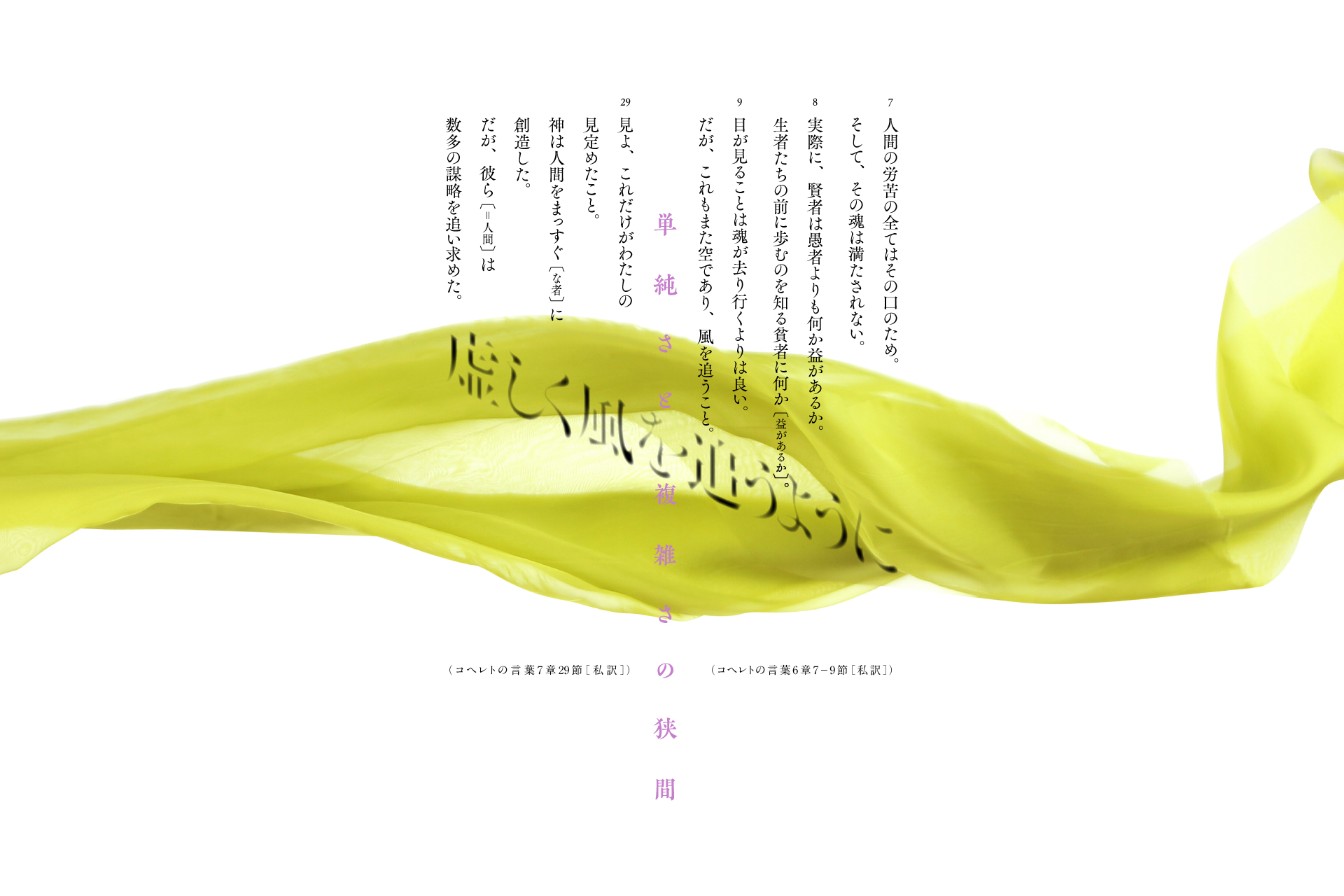 ではどうすればいいのか。答えなんてないのかもしれません。コヘレトでさえそうだったのですから。たとえ辿り着けなくとも、その答えを求めて、「単純さと複雑さの狭間」を彷徨いつつ、「虚しく風を追うように」生きるほかないのではと諦めとも悟りともつかない心情(信条)に辿り着いています。(小林昭博/酪農学園大学教授・宗教主任、デザイン:宗利淳一)