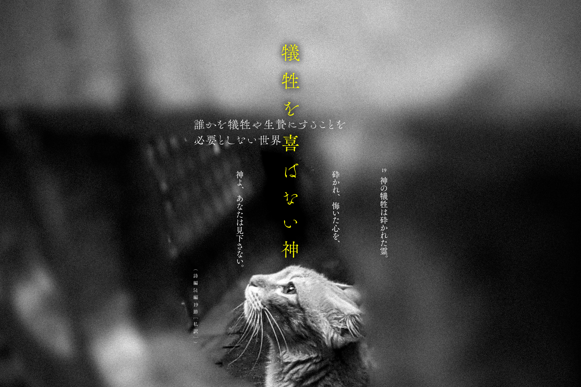 そして、詩編51編の神は――「ホロコースト」のみならず――あらゆる「犠牲を喜ばない神」でもあるのですから、過去・現在・未来へと続いている戦争による「犠牲」をも喜ばないのです。詩編51編の詩人が求めた犠牲を必要としない世界は、現代世界を生きるわたしたちにとっても重要なものであり、「戦争」をはじめとする誰かを「犠牲」や「生贄」とすることを必要としない世界を求めていきたいとの思いを新たにします。(小林昭博/酪農学園大学教授・宗教主任、デザイン:宗利淳一)