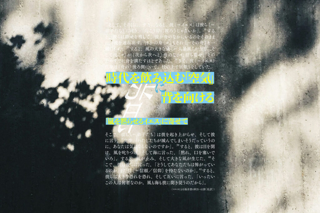 現代の日本社会は、かの戦争の反省などどこ吹く「風」といった「日本人ファースト」の「空気」が拡がっています。この「空気」に怯えて暮らさざるを得ない人たちがいる現実は、80年前の日本の「空気」の再来であると同時に、同じ「空気」がガザの人たちの命を奪っていることにつながっていることにも思いを至らせます。イエスは弟子たちが嵐に怯えて一斉に飲み込まれてしまった「空気」など存在しないかのように居眠りを続け、その「空気」の支配を拒み、同じ「空気」に同調させようとする「空気」にさえも背を向けているかのようです。敗戦/戦後80年の猛暑の8月を迎えますが、イエスの姿に倣い、時代を飲み込む「空気」に――たとえ堂々と抵抗できなくとも、居眠りする程度には――背を向けることを一緒にしてはみませんか。(小林昭博/酪農学園大学教授・宗教主任、デザイン/宗利淳一)